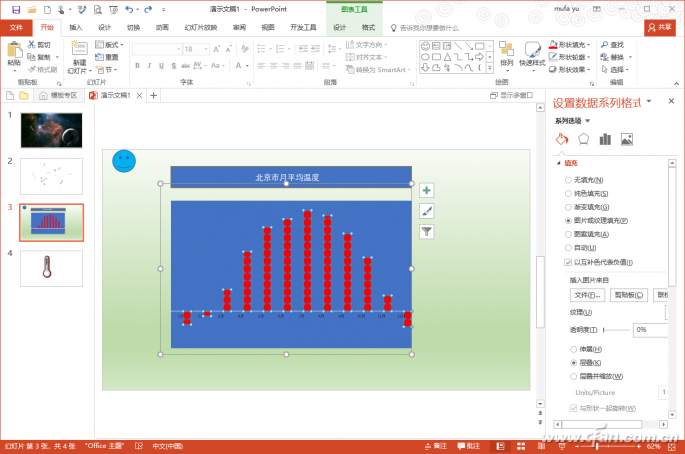 当然在PPT中我们还可以对图形进行更改以更适合展示。比如可以直接使用笑脸形状替代柱形图。在PPT中点击“插入→形状→笑脸”,将笑脸图标填充为红色并且复制。在图标去选中柱形图,按下Ctrl+V粘贴,这样原来的柱形图就会变为笑脸图标。默认图标是拉伸显示,右击数据图选择“设置数据系列格式”,切换到“填充与线条→填充“,将填充方式设置为”层叠”,这样显示方式是不是更为直观。