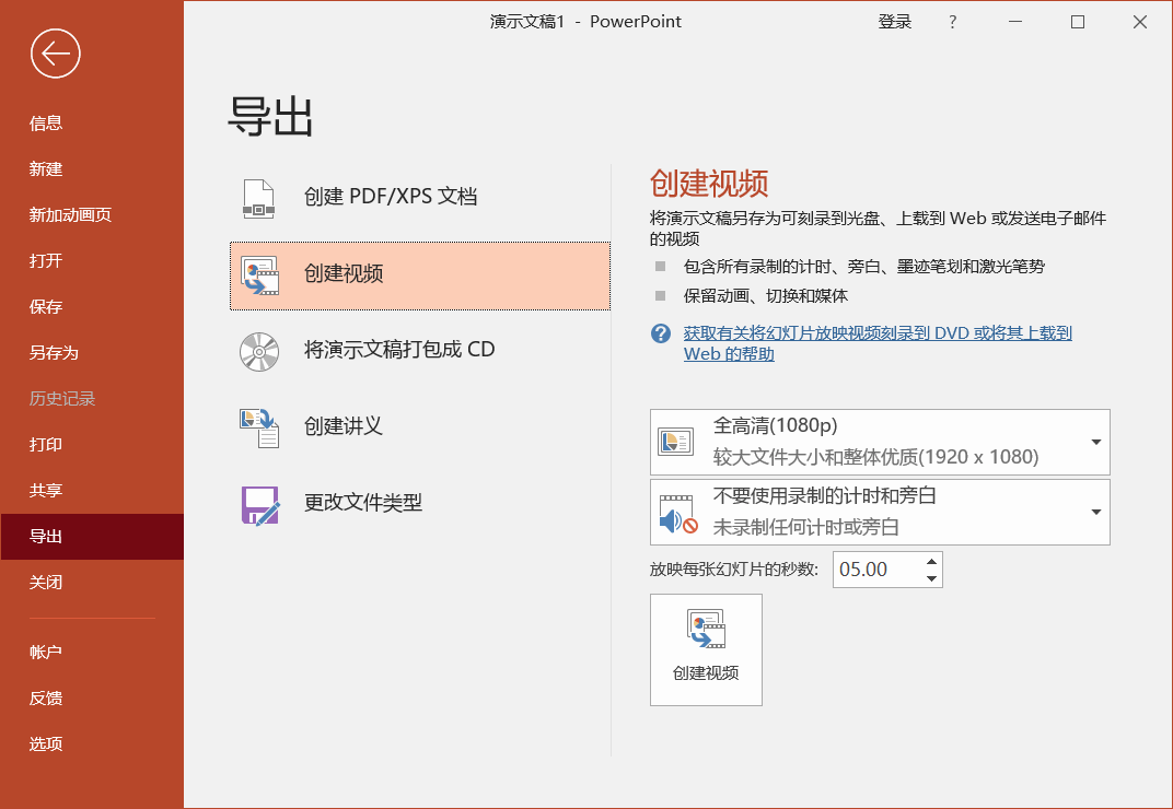 单击文件—导出—创建视频,选择导出的视频规格,有4K、1080P、720P、480P,不使用录制旁白,放映每张幻灯片的秒数设置为0,这样可以达到较好的播放效果。单击“创建视频”按钮,在另存为对话框中可以选择文件保存类型,有MP4和WMV两种格式,最后单击“保存”按钮保存视频。