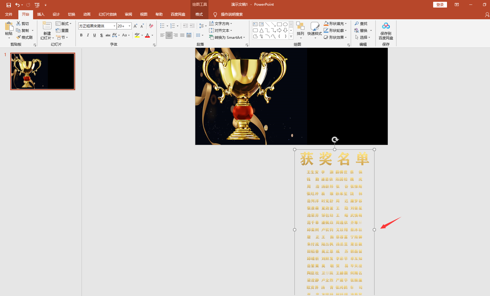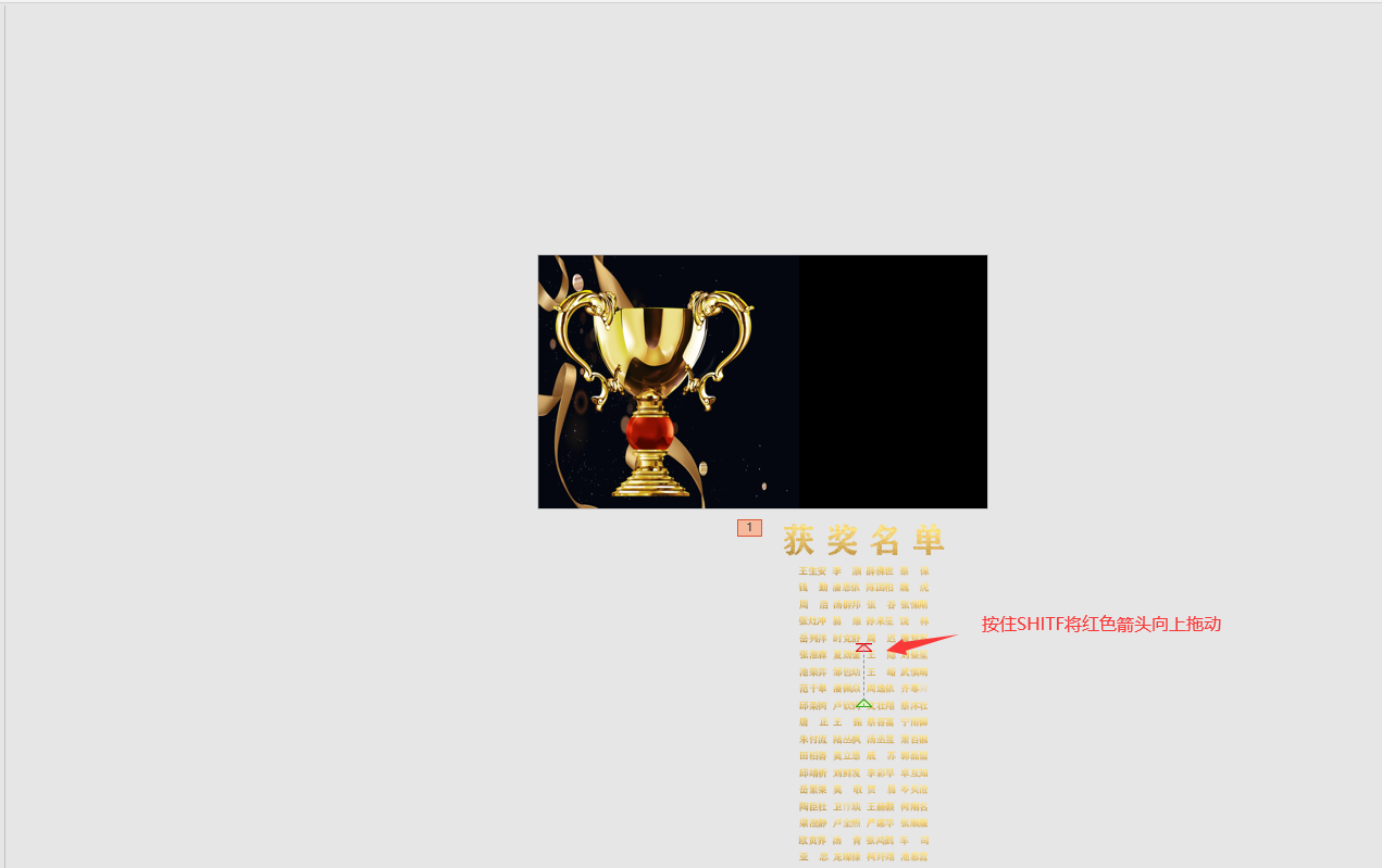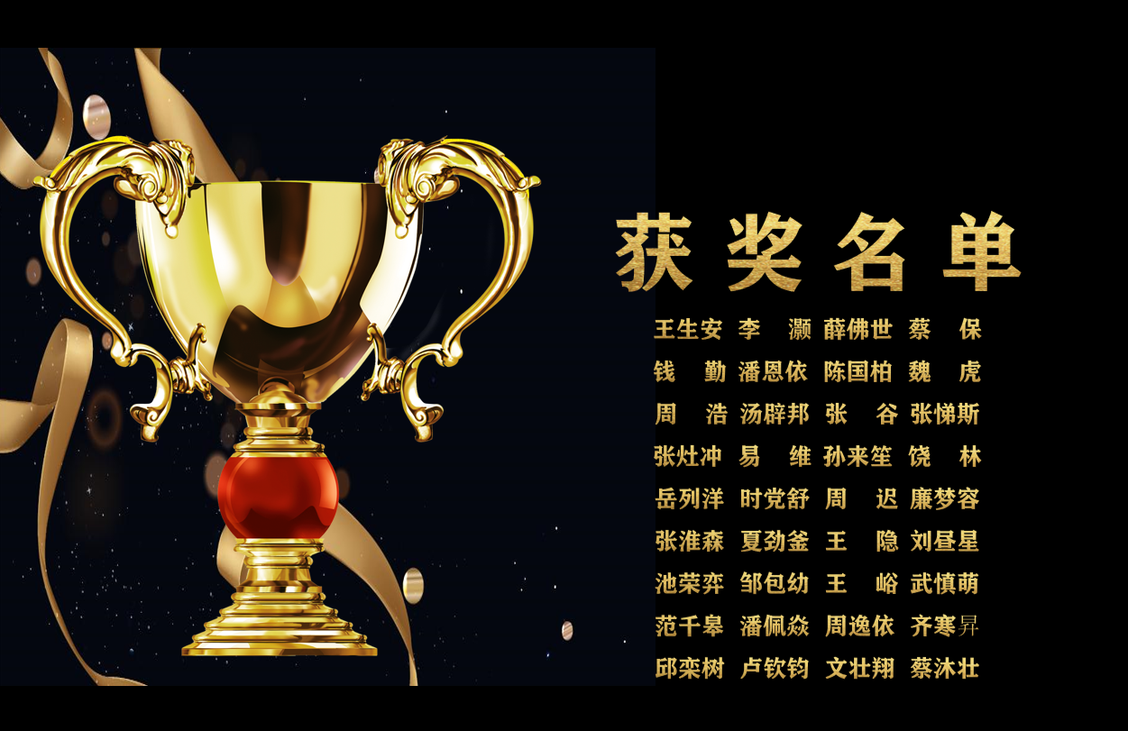メ我们现在PPT主页面下方编辑好文字,获奖名单以及姓名,合并成一个文本框。メ