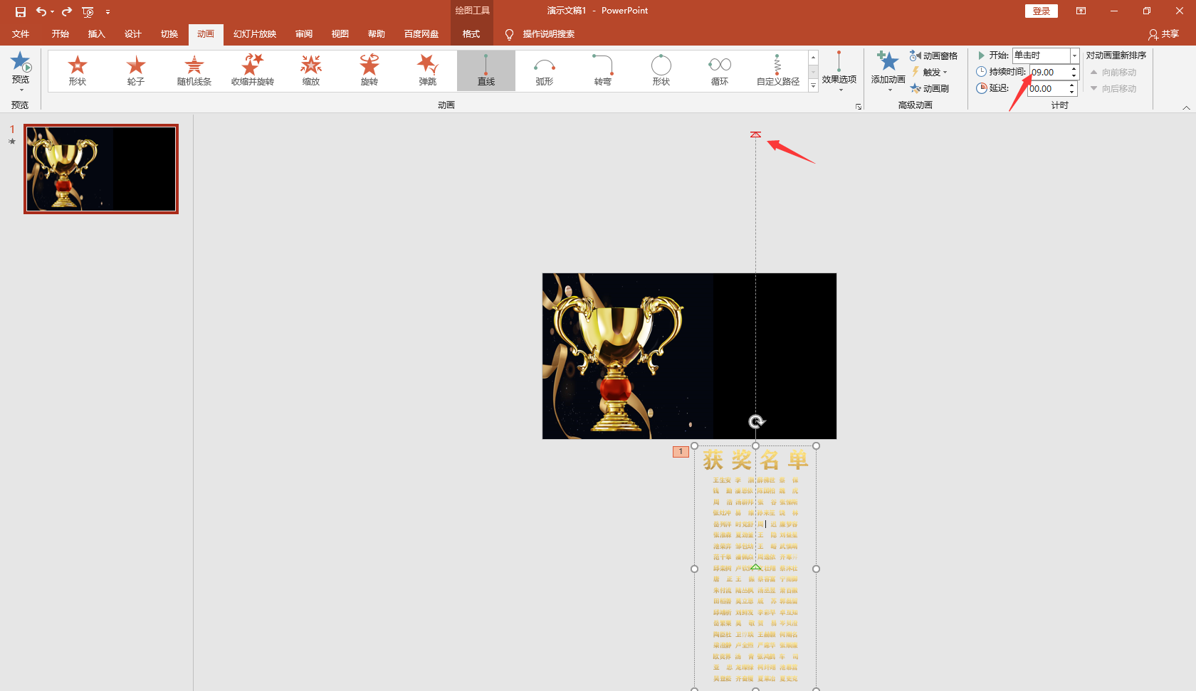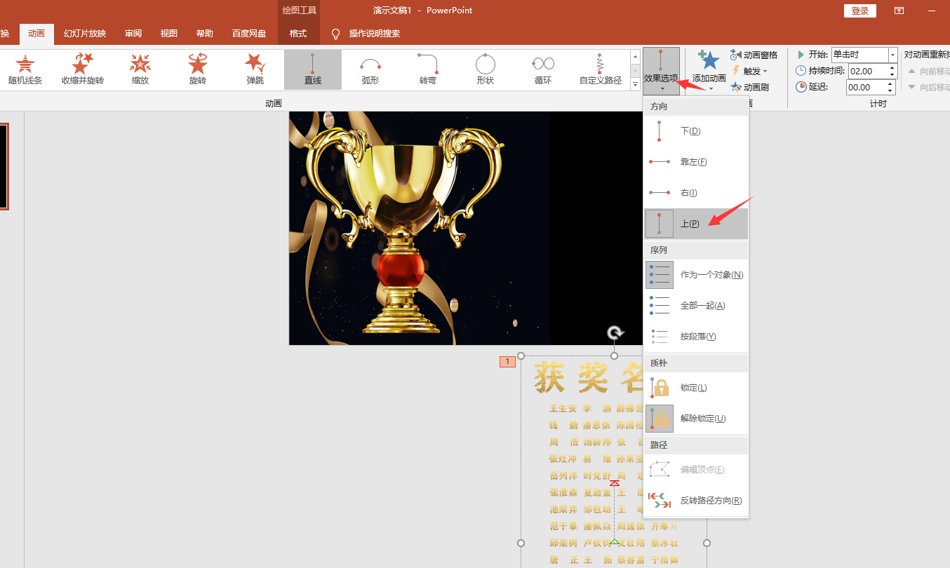 メ大家请看范例图片,PPT获奖名单滚动展示效果设置技巧,字幕上行效果。メ