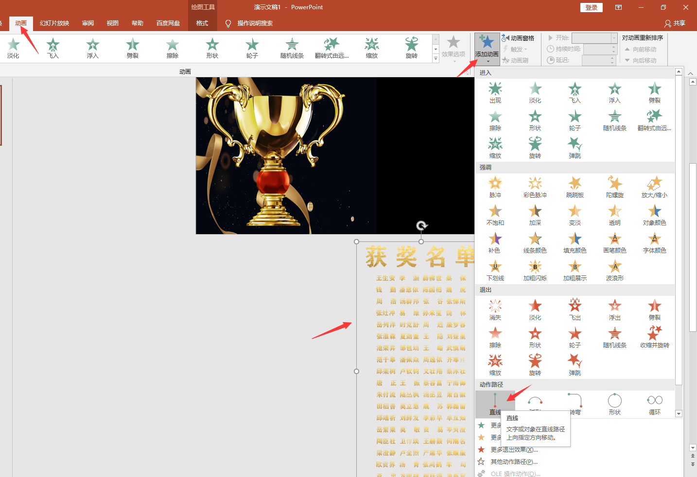 メ点击文本框——动画——添加动画——直线。メ