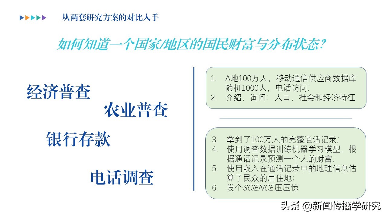 最后多做比较,看看“传统研究”与“计算社会科学研究”在研究的本体论、认识论、方法论、价值论等维度的联系与区别,从研究范式的高度理解计算传播。