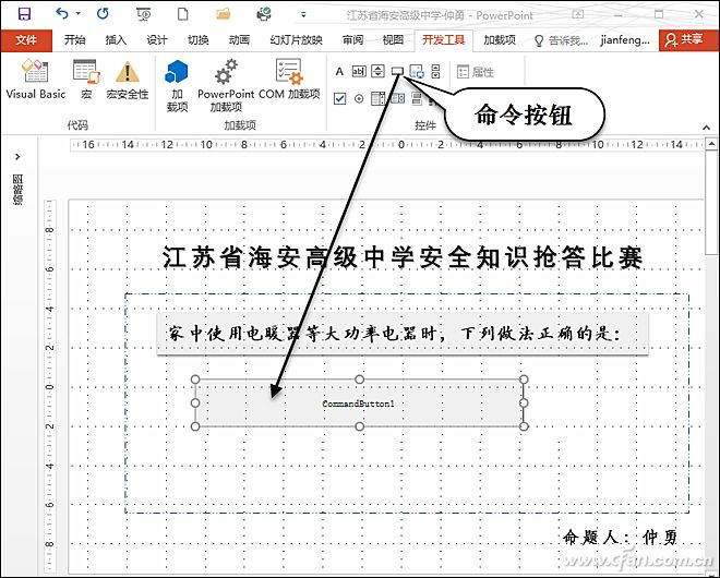 打开Powerpoint2016,先用文本框制作标题等,然后切换到“开发工具”选项,单击“命令按钮”,然后在工作区拖动出一个矩形按钮(图2),修改按钮上的Caption名称为答案即可。