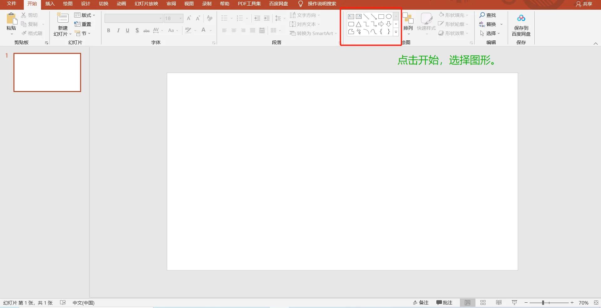第一步:选择好模板,点击在开始,选择自己想要的图形。一般选择矩形。