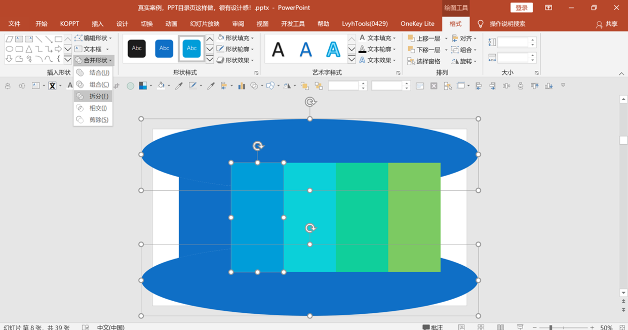 这种特殊的形状,设计起来也比较简单,使用拆分工具即可实现,插入一组形状,然后在上面放2个椭圆,最后再逐个拆分。