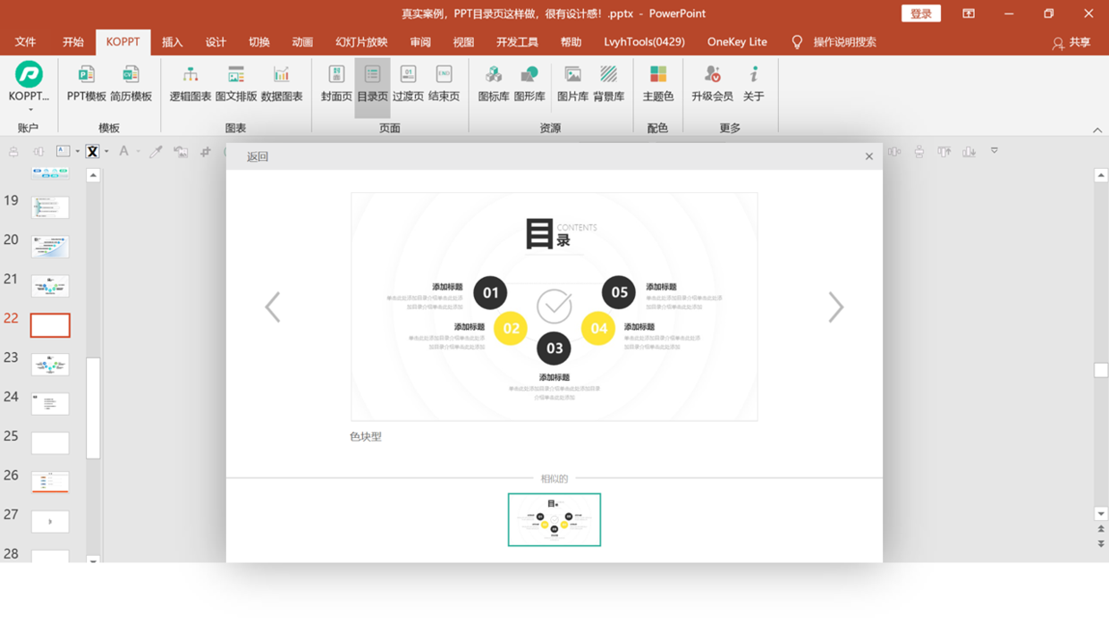 除此之外,再给大家推荐一款插件【KOPPT】,近期看到设计师设计了一波,比较有职场气质的PPT目录页。