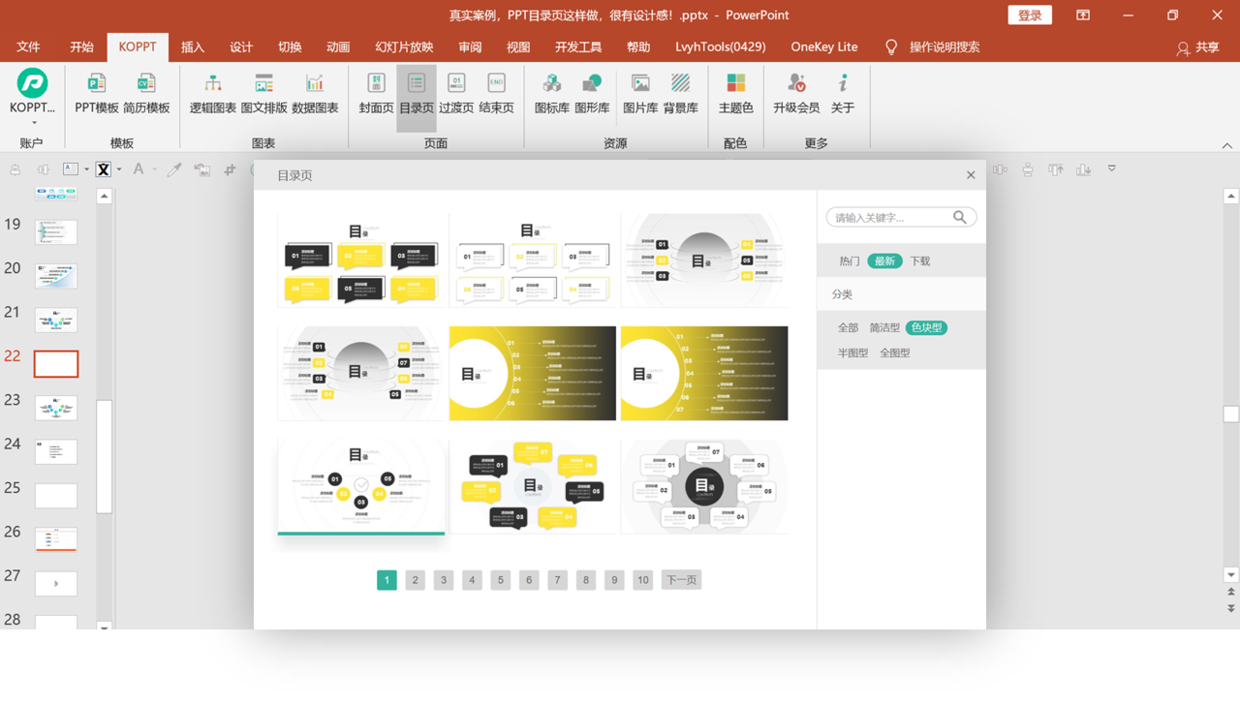 此时,我们在【KOPPT】插件中找到PPT目录页最新,可以看到很多新的目录页。