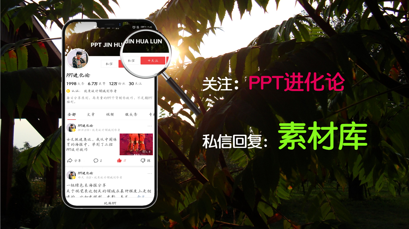 最后,送上我准备好的小惊喜!关注@PPT进化论 ,私信回复关键词【素材库】就能领取超多PPT必备素材了!!