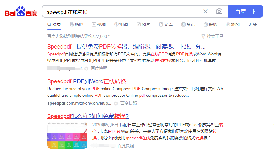 1,首先可以打开百度首面,用“speedpdf在线转换”做为关键词进行搜索,找到并进入转换界面。