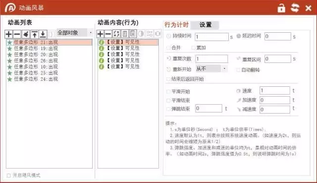 打开动画风暴,添加”自定义动画“,在行为栏中添加两个”可见性“。分别设置”开启“和”关闭“。调整好延迟时间与持续时间。