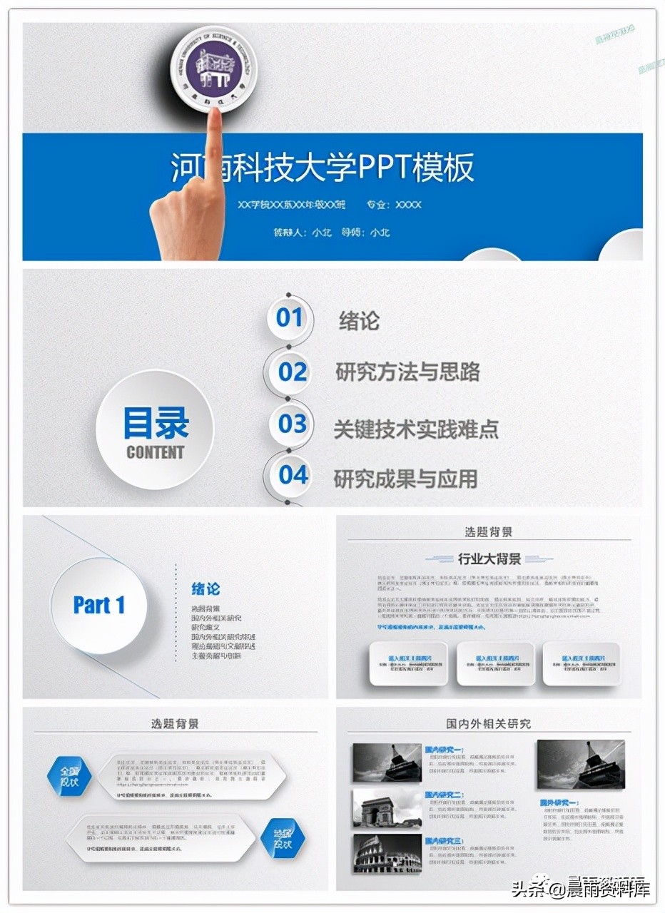 要做一次出色的答辩,除了流利的谈吐、得体的举止和精彩的内容外,一份美观清晰的PPT也是必不可少的。平时大家往往是从网上找免费的PPT,或者在某宝购买通用模板,但难免会觉得缺了点什么。没错!在许多场景下,需要用到本校特色的PPT模板,要有本校的校徽、本校的风景图片……这不,晨雨就为大家带来一系列的高校专属PPT模板,为你的展示增添几分独特~