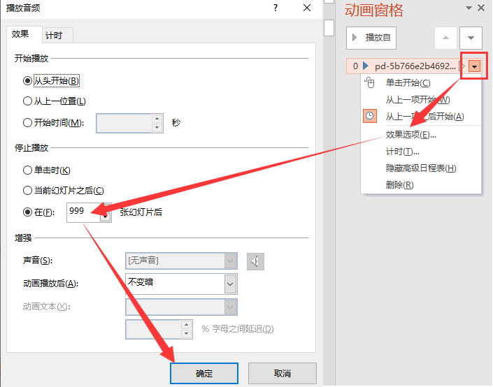 4、点击[▼]→[效果选项]→设置在[999]张幻灯片后停止播放→[确认],如图4