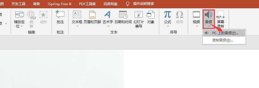 1.1、打开要插入背景音乐的Powerpoint,菜单栏点击[插入]→[音频]→[PC上的音频],如图1。