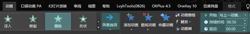 擦除动画,效果选项自左侧,开始为与上一动画同时,持续时间0.5秒,无延迟