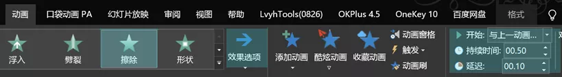 进入动画中的擦除动画,效果选项自左侧,开始为与上一动画同时,持续时间为0.5秒,延迟为0.1秒