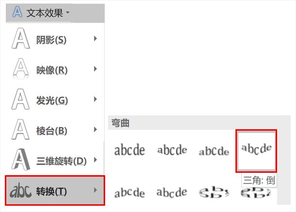 ❷【格式】-【文本效果】-【转换】,选择【三角:倒】;