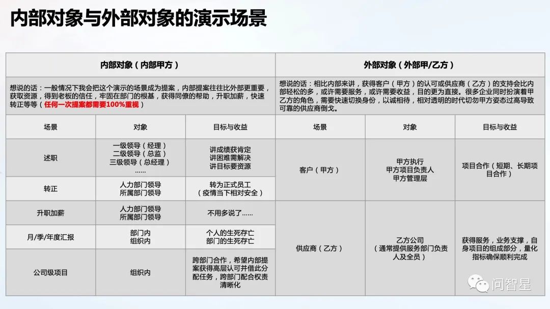 内部对象:公司内部的老板,同僚,跨部门同事等称之为内部对象,很多时候公司内部的甲方更需要我们重点关注的。
