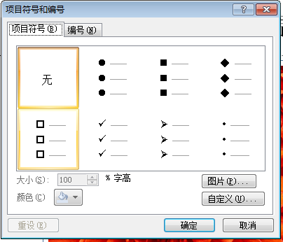 - 要将符号列表中的字符添加到“项目符号”或“编号”选项卡上,请在“项目符号”选项卡上单击“自定义”,单击一个符号,然后单击“确定”。可以从样式列表中将符号应用到幻灯片。