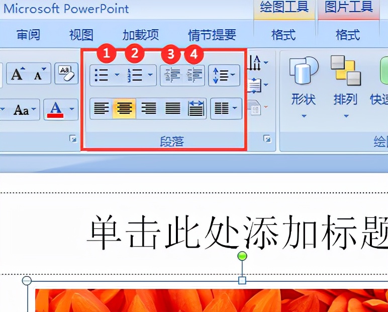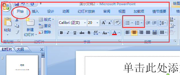 要对幻灯片中的项目符号或编号进行更改,请在“开始”选项卡上的“段落”组中单击“项目符号”或“编号”按钮上的箭头,然后单击“项目符号和编号”。
