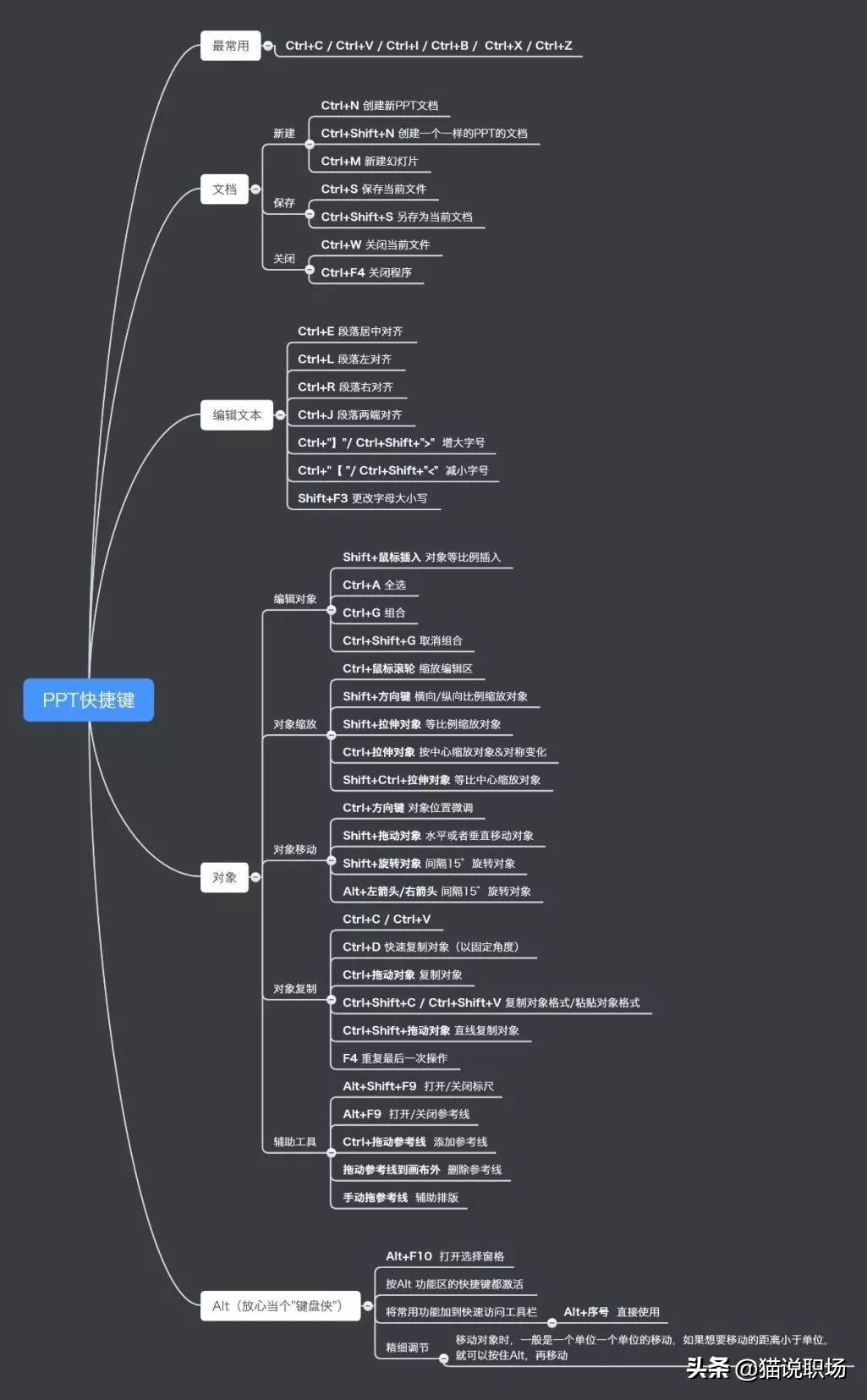 这里先上一张快捷键全图,建议点赞收藏,做PPT的时候翻出来对照着看。