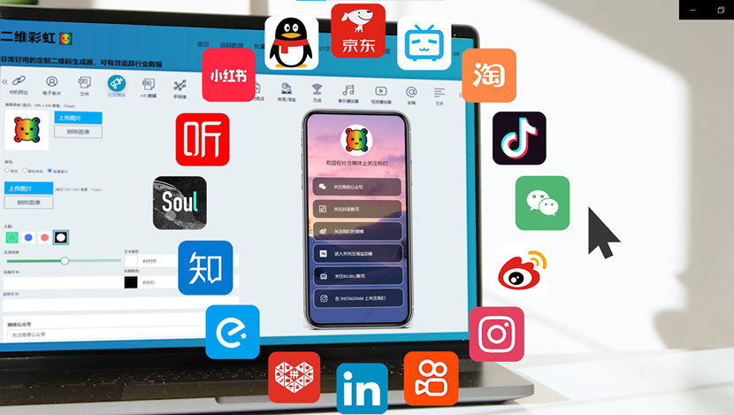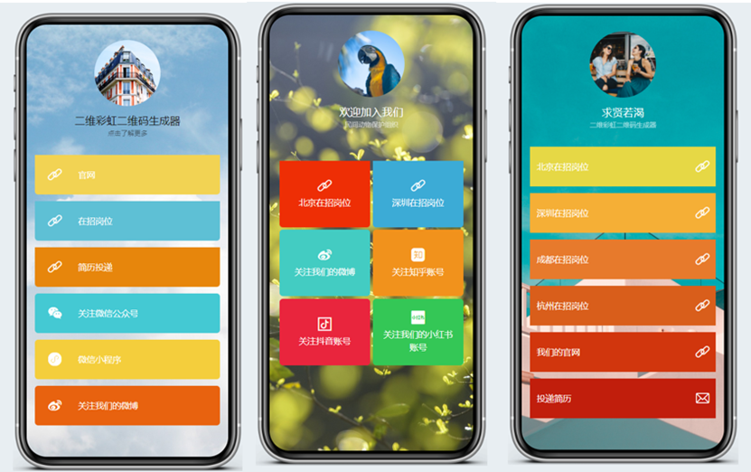 目前大部分应用的二维码,都是只能单次跳转到一个链接,或者是显示一份文件。但是社交媒体二维码支持在一个界面显示多个链接、多个渠道信息。比如:企业官网、企业社交媒体渠道(微信、微博、抖音、小红书、知乎、小程序、淘宝店铺、京东店铺、饿了么、美团等等)、企业APP下载、招聘信息、联系方式、简历投递渠道等……