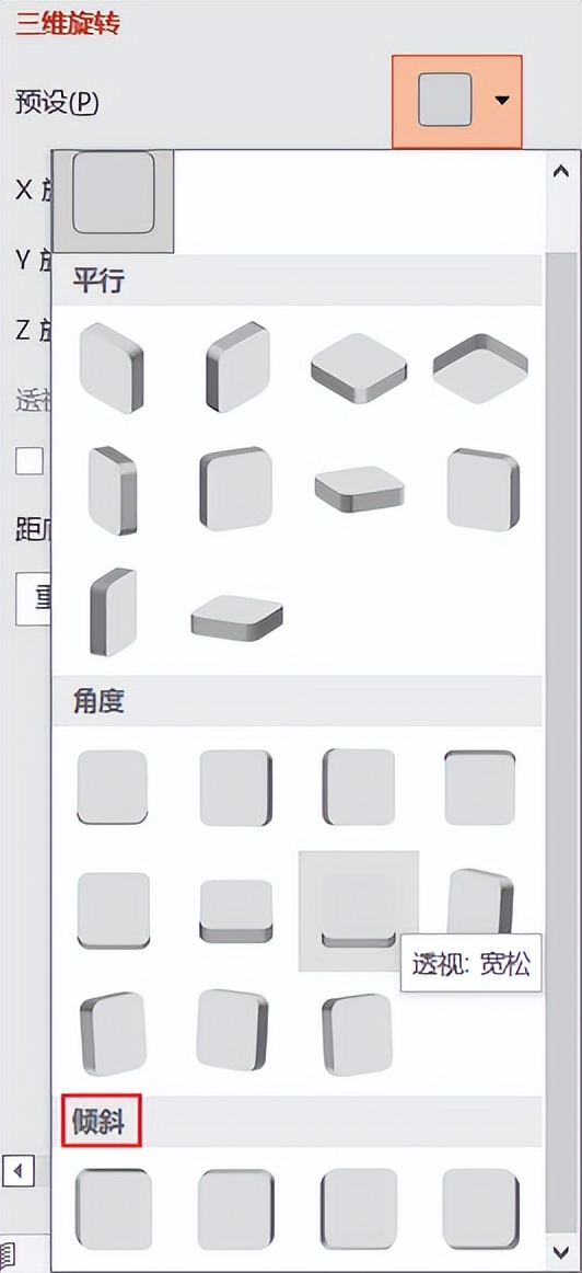 在“三维旋转”中点击“预设”二字旁边的按钮,滚动到最下方的“倾斜”: