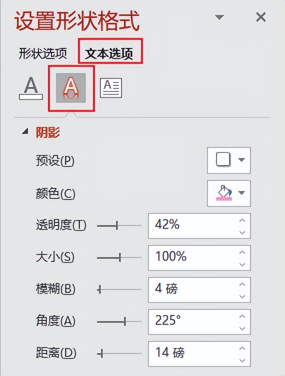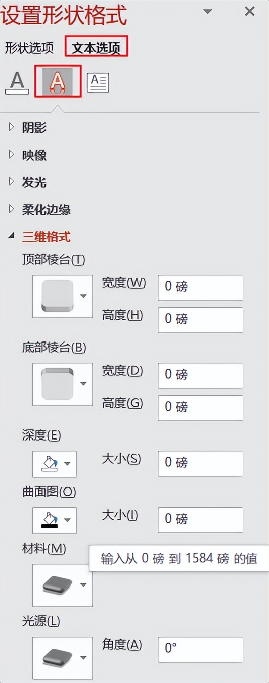 右键单击此文本框,选择倒数第三项的“设置形状格式”,在右侧的控制面板中选择“文本选项”,再单击下方一排三个按钮中的“文字效果”图标(第2个图标),选择其中的“三维格式”: