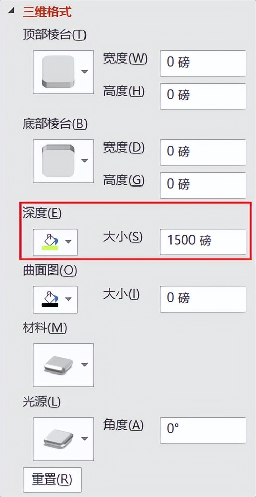 在“深度”那里,设置阴影的颜色,大小设置为“1500磅”: