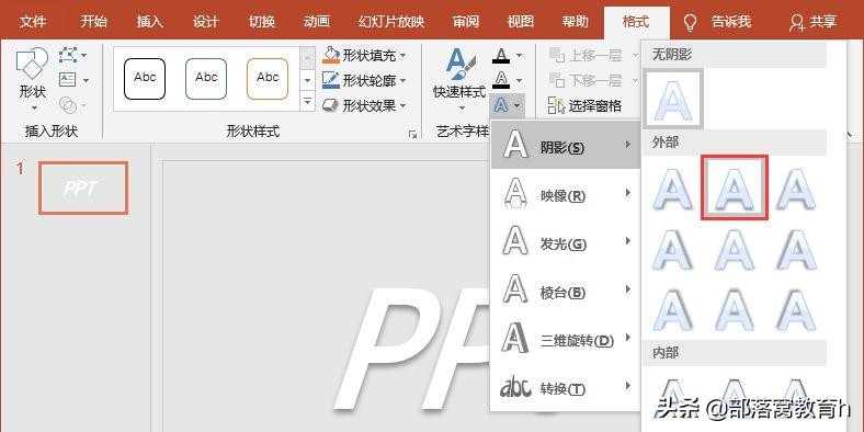 7.第三步:选择文本,点击【格式】-【艺术字样式】-【文字效果】按钮,在弹出的菜单中选择”阴影”-“偏移-下“效果,如下图所示