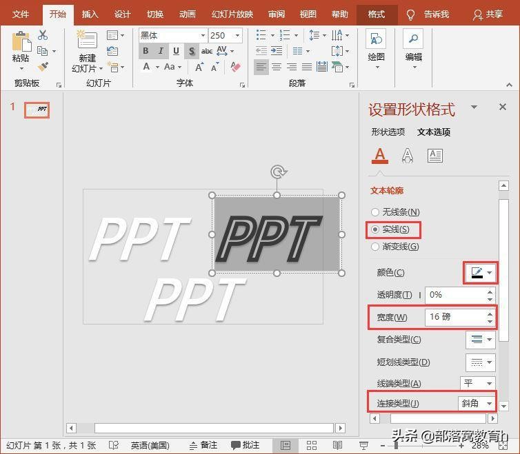 10.第五步:打开”设置形状格式“对话框,选择”文本选项“,在”文本轮廓“栏中选中”实线”单选按钮,然后设置颜色为“黑色”,宽度为“16磅”,连接类型为“斜角”,即得到黑色描边文字效果