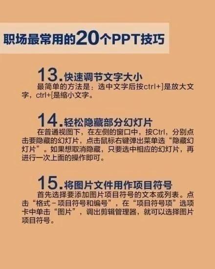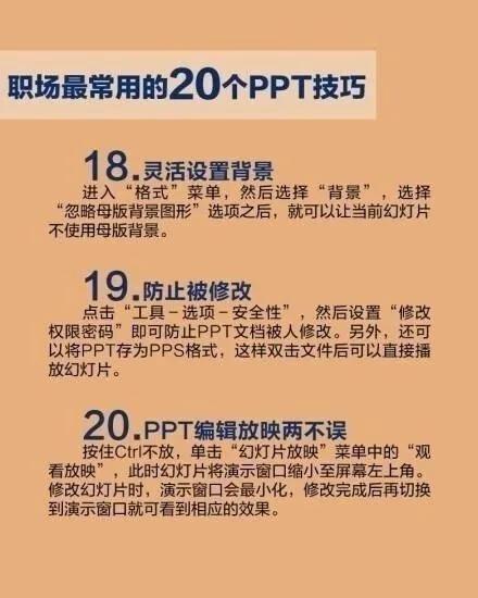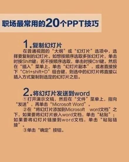 1.1.复制幻灯片2.将幻灯片发送到word3.让幻灯片自动播放4.自动缩略图效果5.快速改变图片颜色6.为 ppt添加logo7.保存特殊字体8.图片随时更新9.快速调用其他ppt10.快速定位幻灯片11.制作滚动文本12.利用画笔来做标记13.快速调节文字大小14.轻松隐藏部分幻灯片15.将图片文件用作项目符号16.快速选择多个对象17.打造多彩公式18.灵活设置背景19.防止被修改20.编辑放映两不误