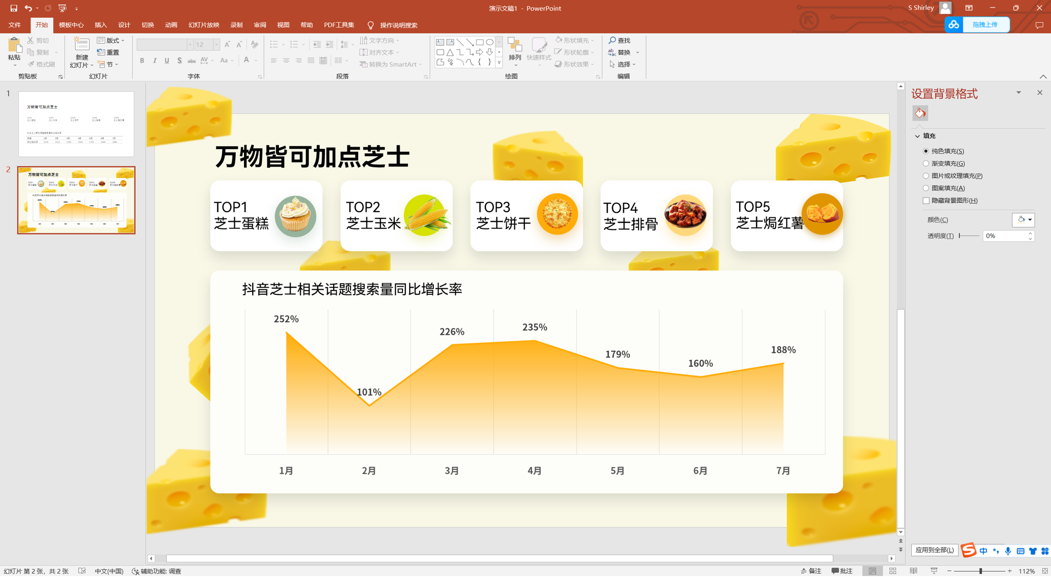 10、基本上调整差不多了,但是觉得背景太单调,就在花瓣网上找了个芝士的图片,通过翻转、调整大小等操作,对背景进行随意的点缀