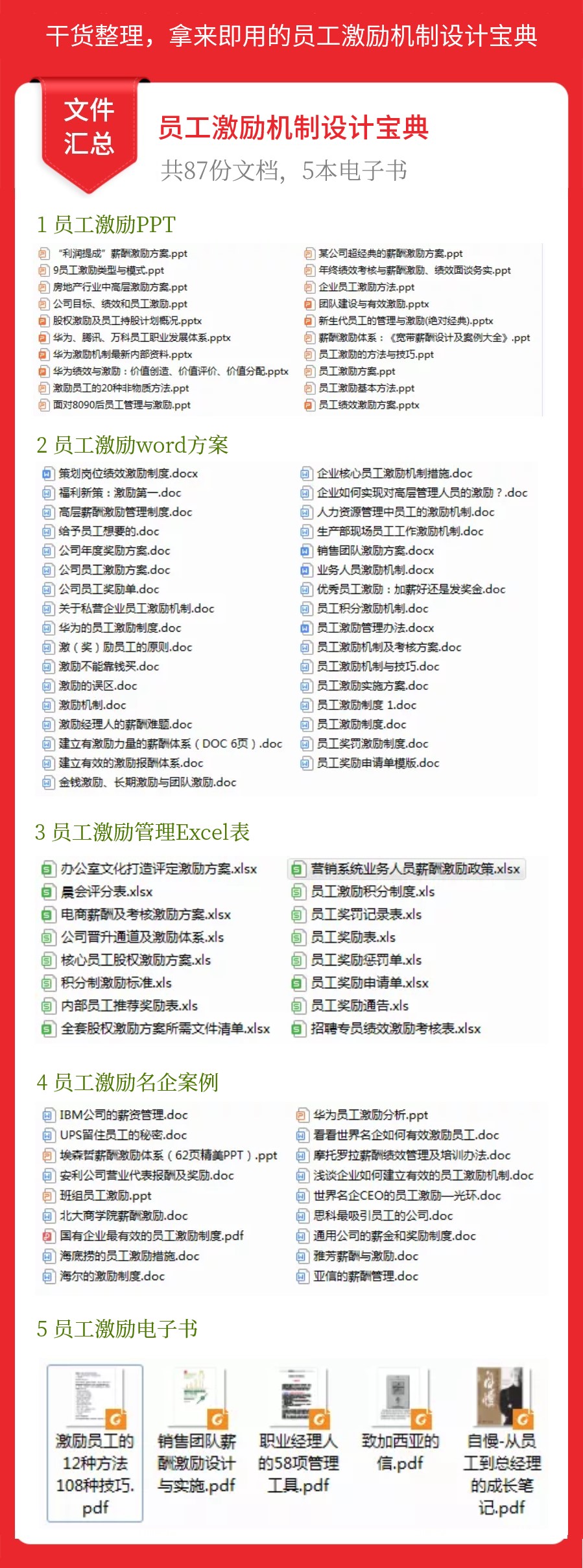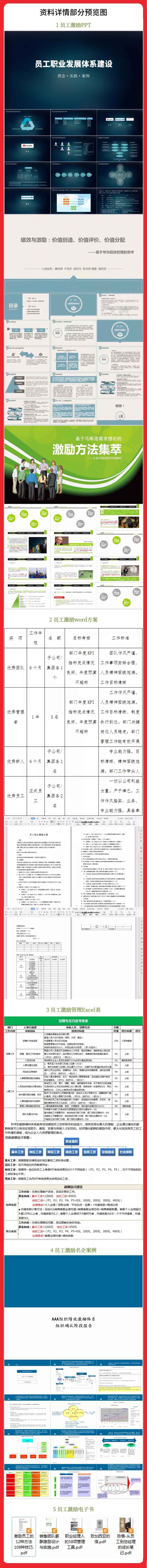 5.《员工激励机制设计宝典》包括:20份制作精美的PPT模板,33份拿来即用的word方案,16份可修改编辑的Excel表。