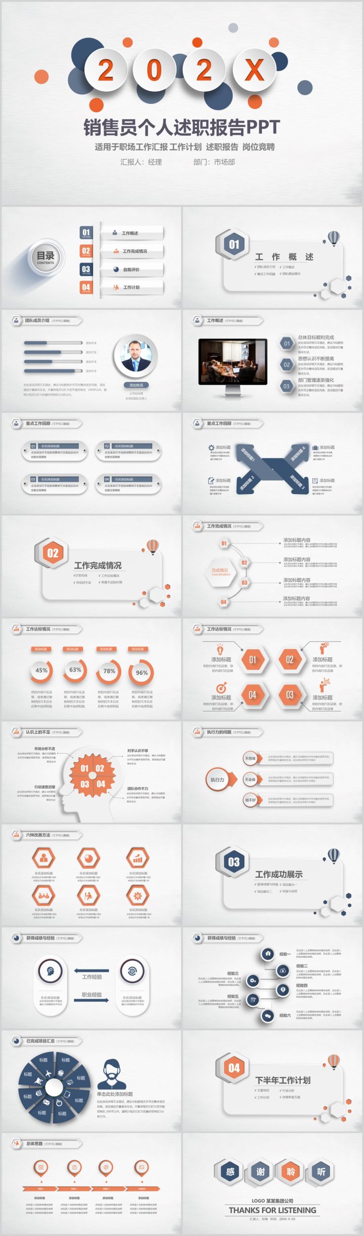 1.适用于职场工作汇报、述职报告、岗位竞聘的PPT模板微粒体销售经理个人转正述职报告PPT模板_【OVO图库】这套微粒体风格的述职报告PPT模板采用了立体的几何图形设计,以白色、橙色、深蓝色为主,整体设计简约大气高端。