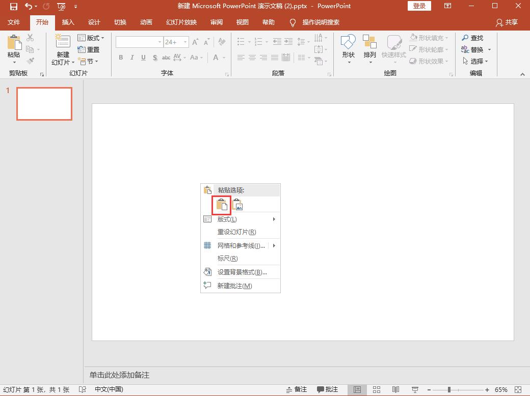 鼠标框选整个图标或者按键盘快捷键: ctrl+a 全选,接下来ctrl+c复制,然后新建一个ppt演示文件并打开,在空白页点击右键,找到:粘贴选项,选择最左边的这个功能图标进行粘贴,如下图: