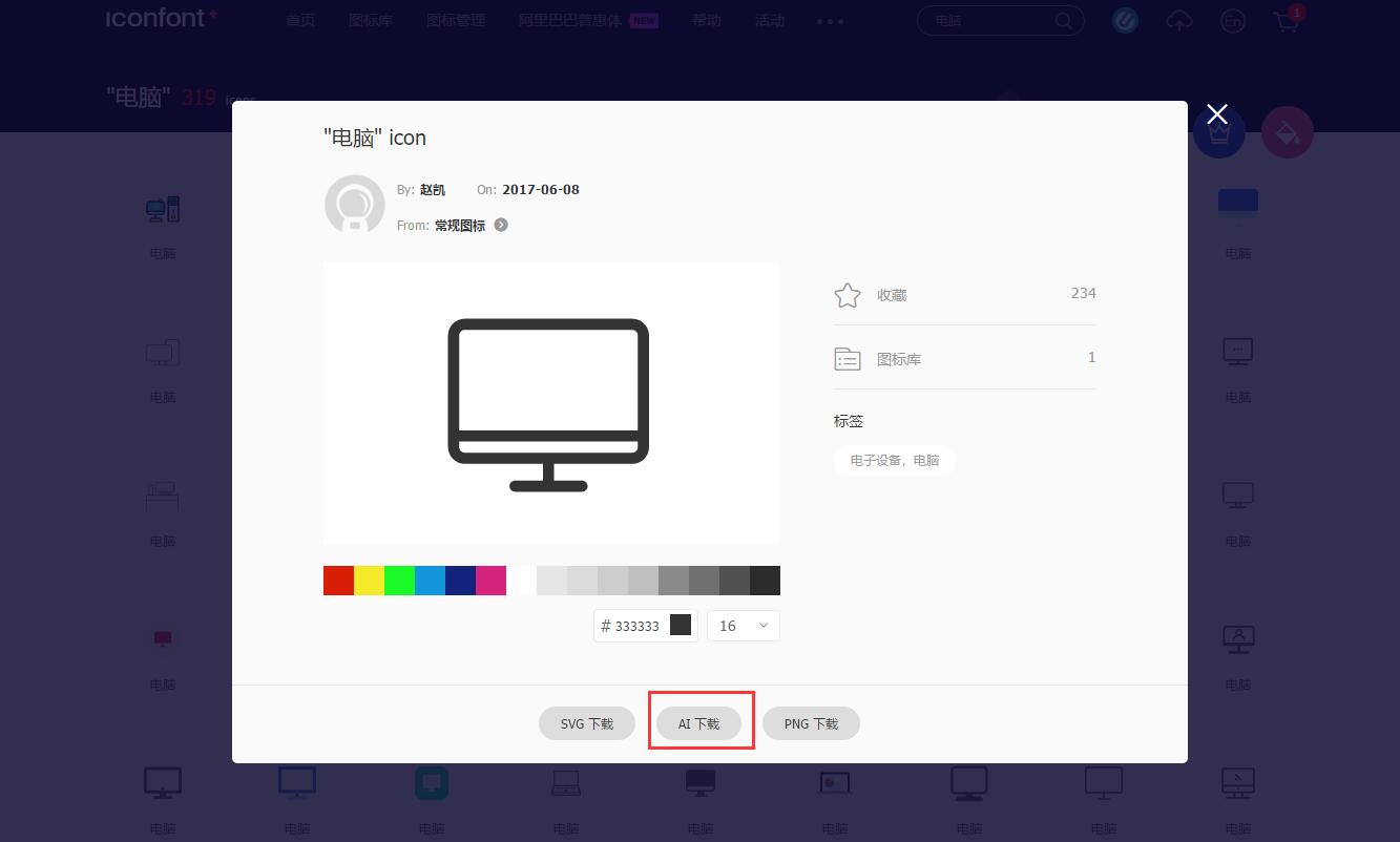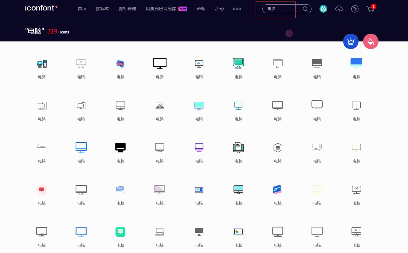 登录后,可以根据自己的需要来搜索相应的图标,比如搜索“电脑”: