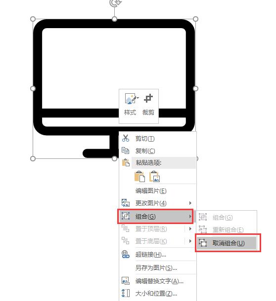 下面用鼠标点击选中这个图标,点击右键-组合-取消组合,如下图: