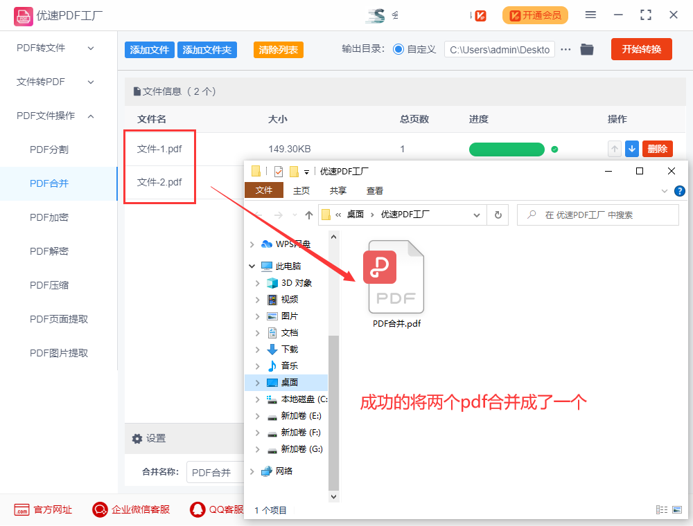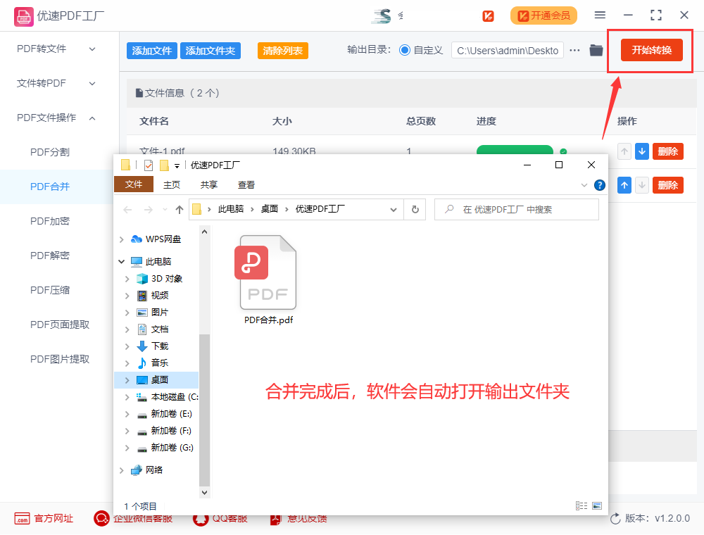 8.第4步、设置完成后就可以点击【开始转换】按钮,启动合并程序了,当软件把两个PDF合并好后软件会自动弹出输出文件夹,方便用户第一时间查看合并好的PDF文件