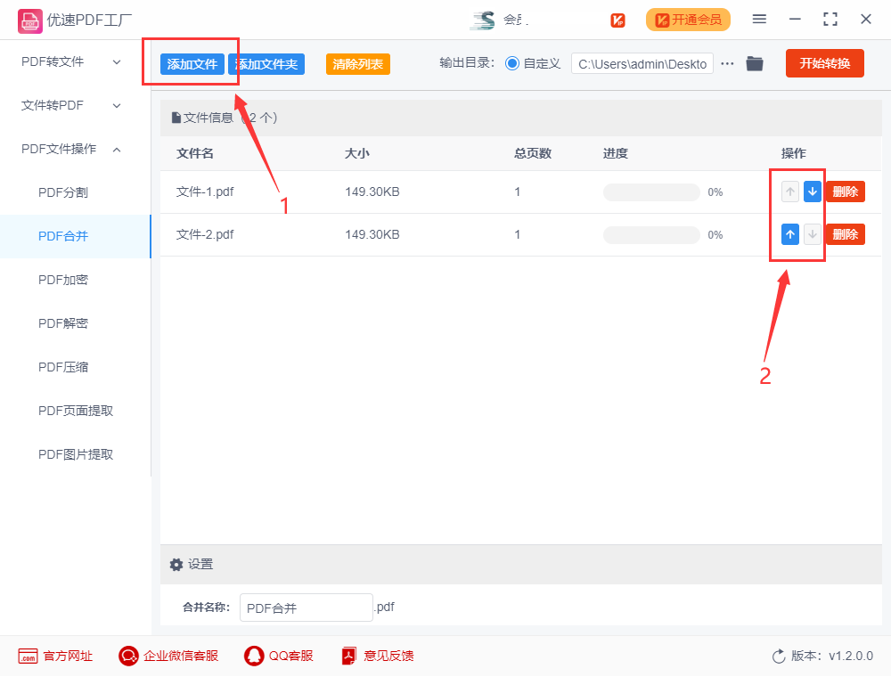 6.第2步、点击内页左上角的【添加文件】按钮,上传需要合并的两个PDF文件,当然也可以用鼠标直接两个pdf拖入软件;若是需要调整合并顺序,可通过点击上下蓝色箭头来调整