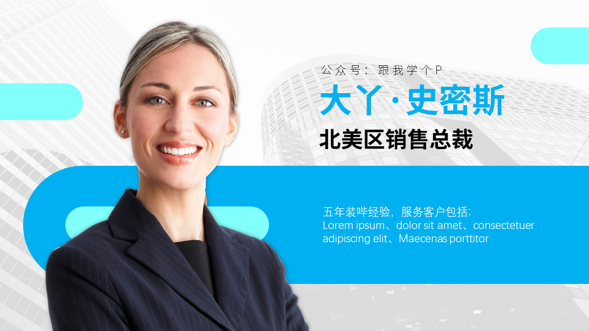 不慌,面对这种单人介绍的版面,木哥比较推荐下面这种【几何背景+人物大图】的套餐——把人物放在几何背景上,就完事了: