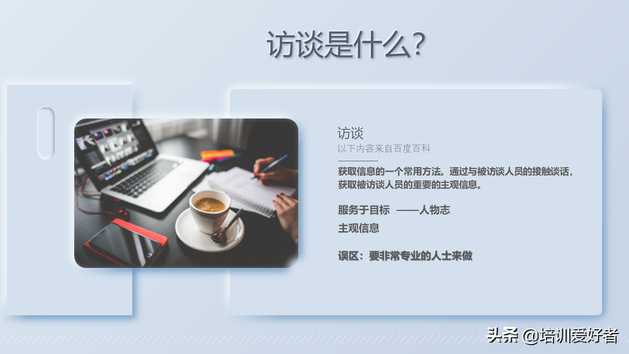 整理资料时,翻出来之前和人事的伙伴一起做企业文化工作时梳理的人物志的访谈操作手册。为免积灰,放上来给小伙伴们,有需要请联系小编获取PPT。