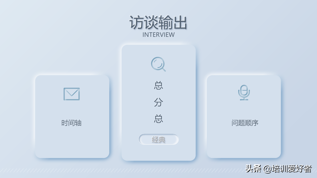 最后,输出访谈稿件时,常用的三个稿件大纲形式就是:按照整个时间发生的时间轴来撰写、总分总结构、按照访谈的问题设计来撰写
