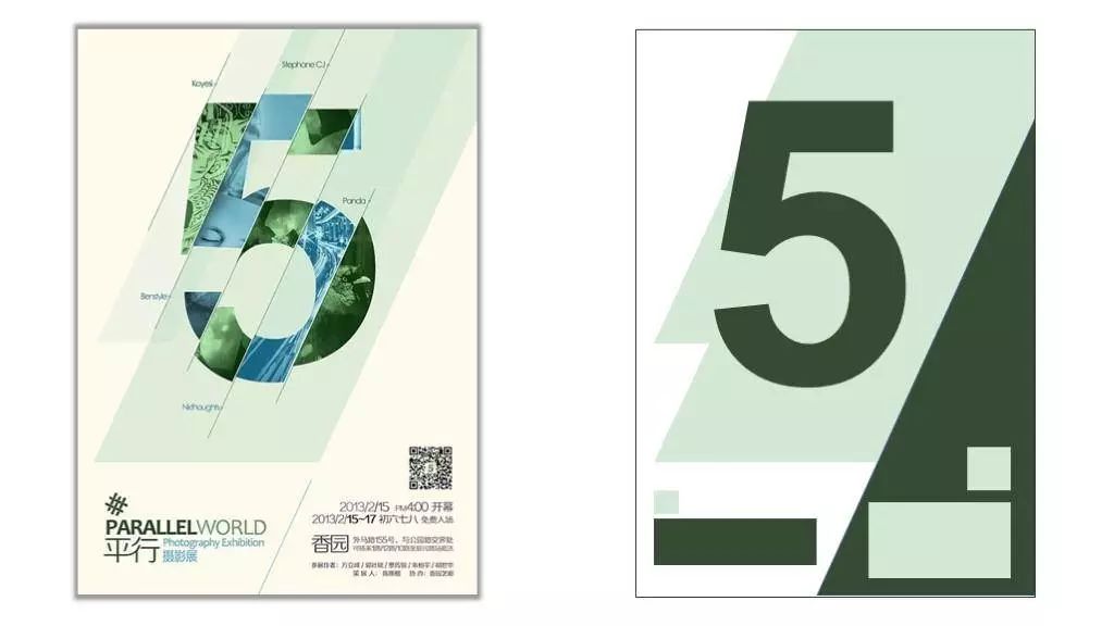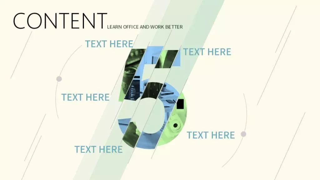 什么?这个割裂的「5」是怎么做出来的?很简单,通过【合并形状】-【相交】将文本框里的文字转变为形状格式,复制出 5 个,再分别和五个平行四边形合并形状-相交,最后调整一下五个形状的位置就可以啦!