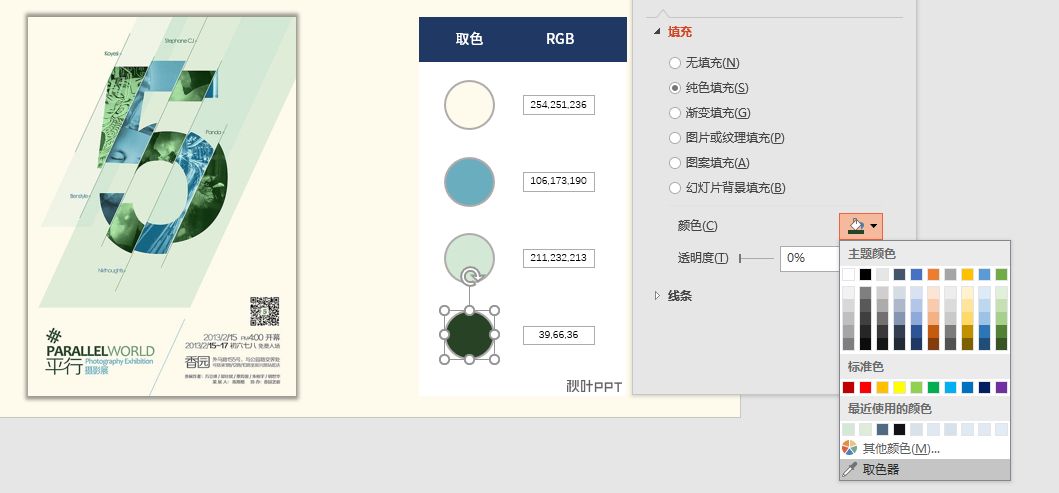 优秀的配色永远是设计师的心头爱,高大上的配色是 PPT 的加分项,我们可以通过 PPT 自带的取色器功能将海报中的配色提取出来,做成配色卡片,供以后使用。