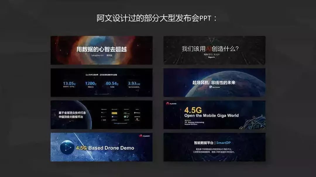 比如我们阿文男神的一些作品,不断颠覆人们对 PPT 的认知,在众多高端企业发布会上,我们都能看到,他的 PPT 作品在高大上的路上越走越远。