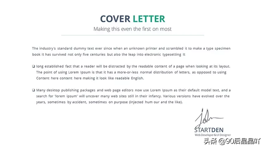 - 可选的联系信息。邮寄地址,简短的专业职务,品牌声明,社交媒体(如LinkedIn),投资组合网站,博客