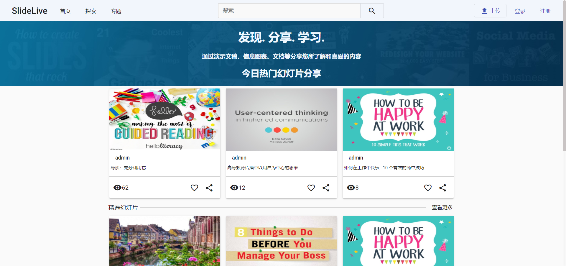 SlideLive是一款好用的幻灯片在线播放和分享平台,里面包含各种主题的幻灯片,同时提供免费下载功能。SlideLive官方地址:https://www.slidelive.cn