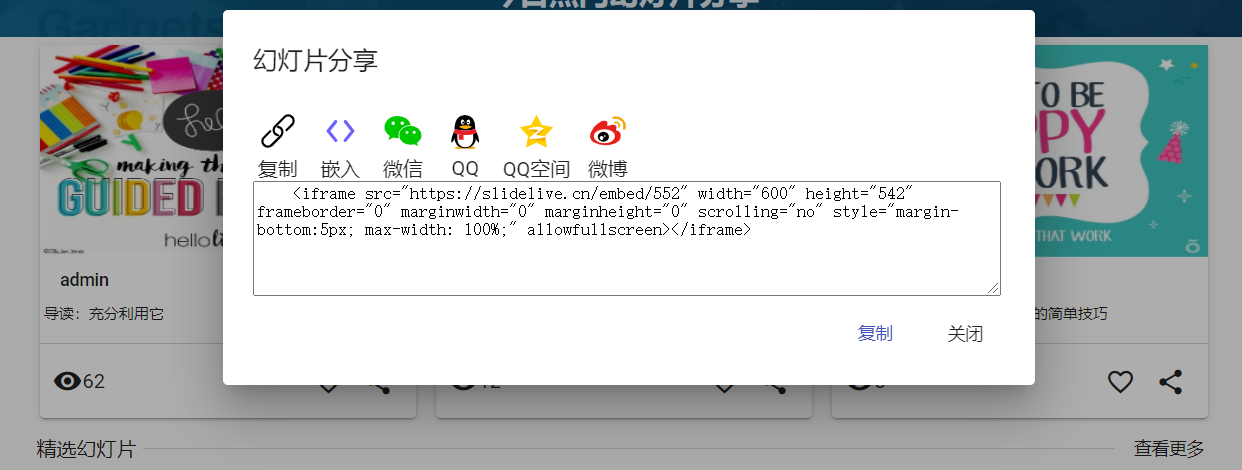 步骤二:点击指定幻灯片的"分享"按钮,选择选择"嵌入",复制代码