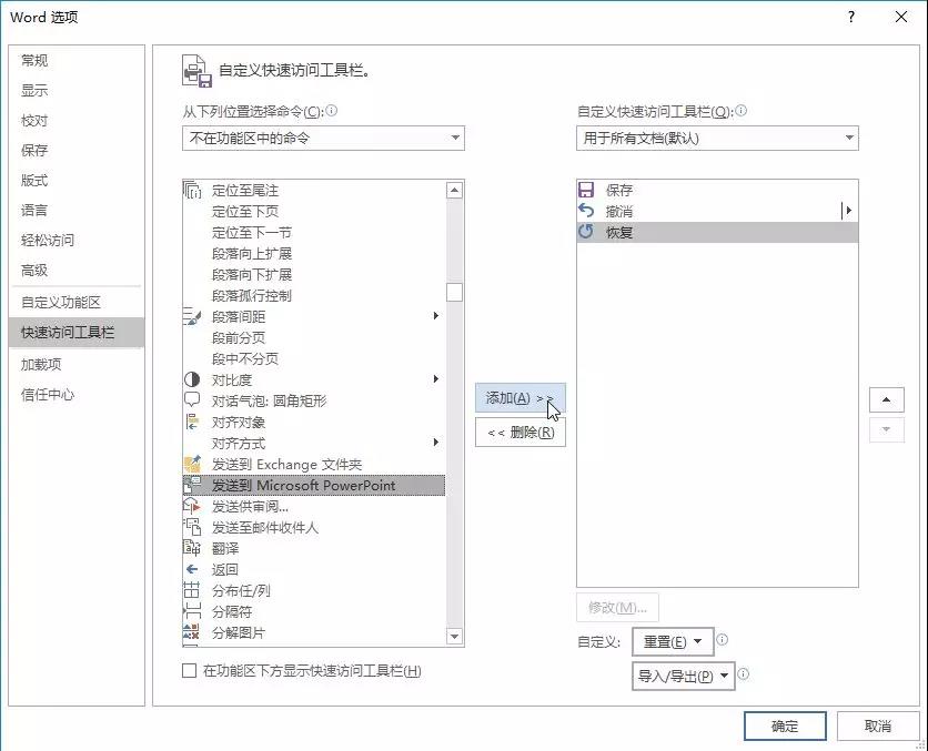找到【发送到Microsoft Powerpoint 的命令】,点击中间的【添加】按钮,再点击下方的确定,就可以把这个命令添加到菜单栏上了。