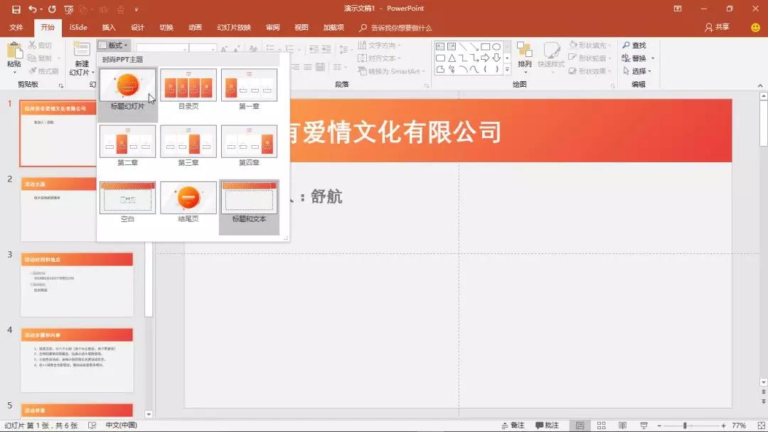 接下来就是过渡页,同样在这里选择一个过渡页的版式应用,然后把第一部分的标题复制过来,可以迅速做好一页过渡页,剩下的也是同样的操作